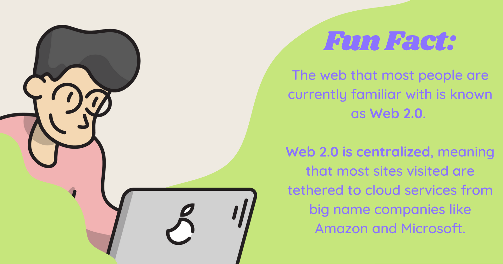 Dato curioso: la web con la que la mayoría de la gente está familiarizada actualmente se conoce como Web 2.0. La Web 2.0 está centralizada, lo que significa que la mayoría de los sitios visitados están conectados a servicios en la nube de grandes empresas como Amazon y Microsoft.